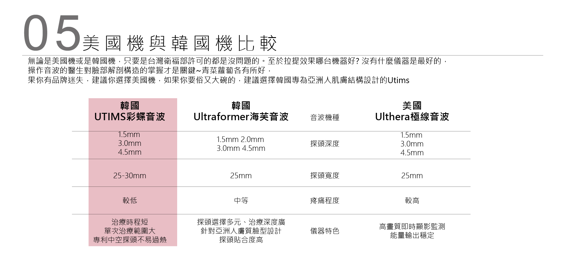 無論是美國機或是韓國機,只要是台灣衛福部許可的都是沒問題的。至於拉提效果哪台機器好? 沒有什麼儀器是最好的,操作音波的醫生對臉部解剖構造的掌握才是關鍵~青菜蘿蔔各有所好,果你有品牌迷失,建議你選擇美國機,如果你要俗又大碗的,建議選擇韓國專為亞洲人肌膚結構設計的Utims。