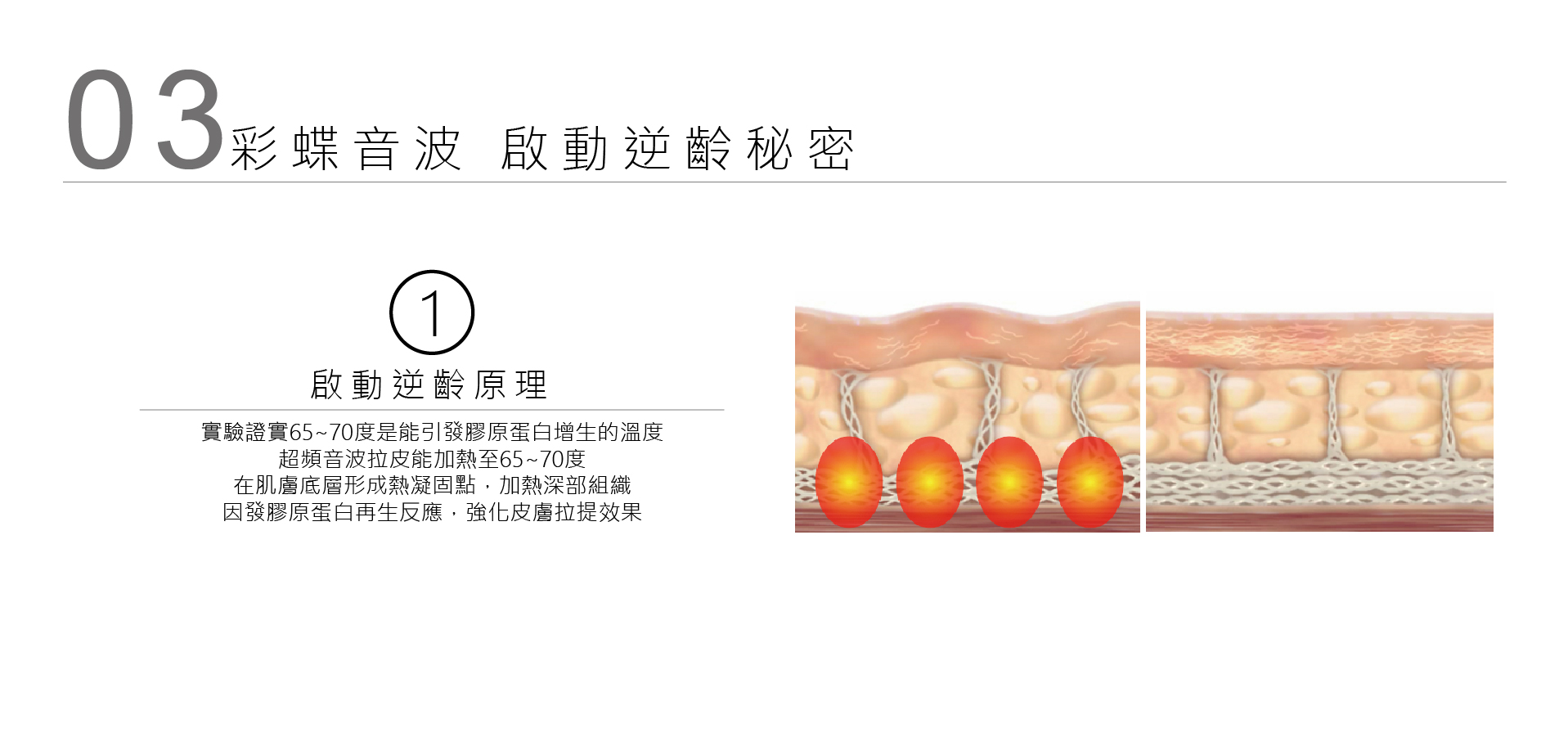 實驗證實65~70度是能引發膠原蛋白增生的溫度,超頻音波拉皮能加熱至65~70度,在肌膚底層形成熱凝固點,加熱深部組織,因發膠原蛋白再生反應,強化皮膚拉提效果。