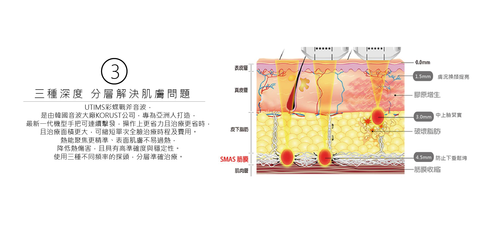 UTIMS彩蝶戰斧音波,是由韓國音波大廠KORUST公司,專為亞洲人打造,最新一代機型手把可連續擊發,操作上更省力且治療更省時,且治療面積更大,可縮短單次全臉治療時程及費用。熱能聚焦更精準、表面肌膚不易過熱,降低熱傷害,且具有高準確度與穩定性。使用三種不同頻率的探頭,分層準確治療。